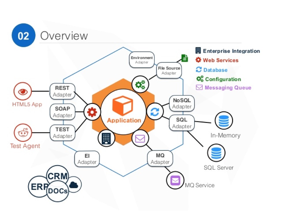 在六边形架构风格中,应用程序的内部(中间的橙色六边形)包含业务规则,基于业务规则的计算,领域对象,领域事件等。而外部的,也是我们平时最熟悉的诸如REST,SOAP,NoSQL,SQL,Message Queue等,都通过一个端口接入,然后在内外之间有一个适配器组成的层,它负责将不同端口来的数据进行转换,翻译成领域内部可以识别的概念(领域对象,领域事件等)。